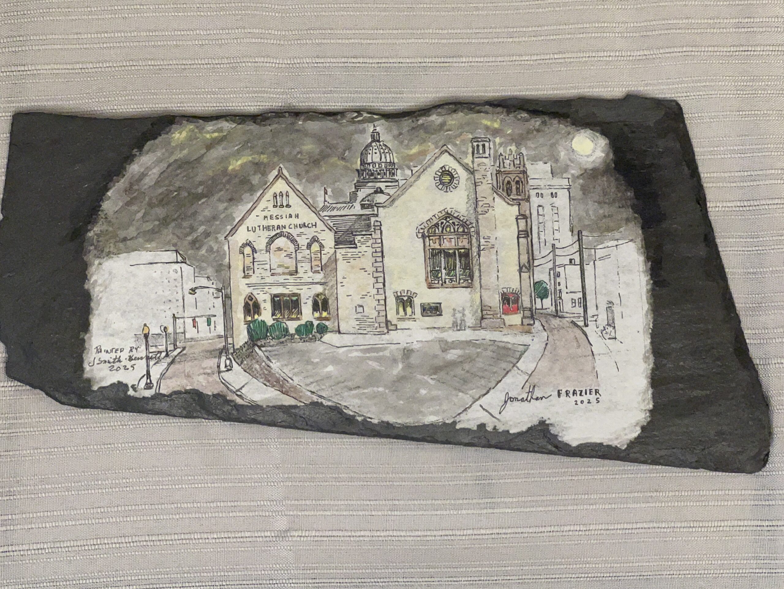 This is an artistic piece of historical relevance. It is the 15th of 16, one-of-a-kind hand-painted watercolors, mounted on 135-year-old remnants of original slate tile roofing that once covered Messiah Lutheran Church in Harrisburg, PA. The piece depicts the centrality of Messiah Lutheran Church, a symbol of faith amidst the local neighborhood and government in the city of Harrisburg, PA. Sketch of Messiah Lutheran Church, Harrisburg, PA rendered by Harrisburg, PA local artist Jonathan Frazier. Hand painted watercolor rendered by JoAnn Moody, Messiah Lutheran Church SJCOC.